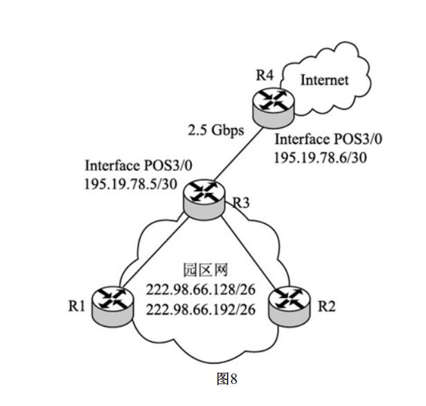 2.如图8所示,某园区网用2.5Gbps的POS技术与Internet相连,POS接口的帧格式是SONET。路由协议的选择方案是:园区网内部采用OSPF动态路由协议,园区